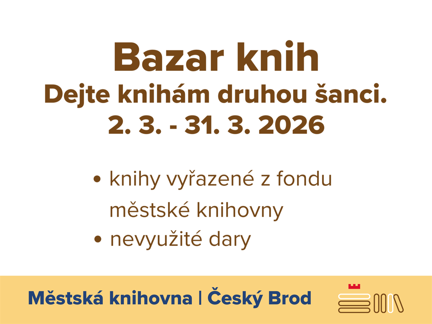 Zveme vás na BAZAR KNIH, který naleznete v chodbě budovy městské knihovny, a to od 2. do 31. března ve vstupní chodbě budovy č.p.1.