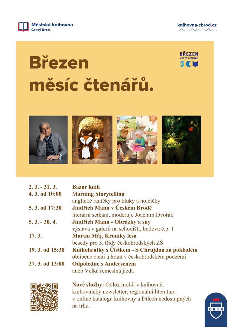 Zveme všechny malé i velké čtenáře a čtenářky do budovy čp. 1.. Všechna patra se zde postupně promění v dějiště různých doprovodných programů. Můžete se těšit na výstavu a besedu s Jindřichem Mannem, bazar knih, ale i oblíbené Odpoledne s Andersenem.