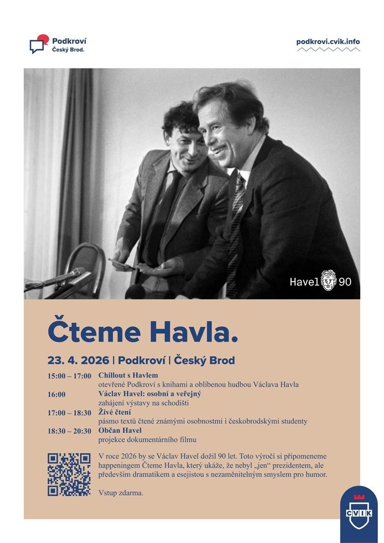 Komponované pásmo Havlových textů čtené známými osobnostmi i českobrodskými studenty. Krátké videoukázky, v nichž čtou autorovy texty známé osobnosti českého veřejného života, doplní vybrané úryvky vybrané a přečtené studenty z místních škol. Společně nabouráme stereotypní představu o tom, že dílo Václava Havla je pro mladé čtenáře příliš složité.