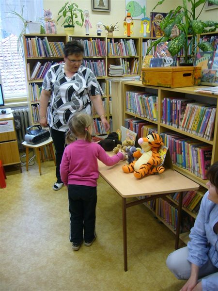 Děti poznávaly zvířata na fotografiích, podle slovní nápovědy přiřazovaly ke zvířatům správné knížky, Dráčata a Bobříci vybírali oblíbené jídlo, Cvrčci a Medvíďata ještě plyšového kamaráda pro tygra, slona, medvěda nebo opici, došlo i na veršované hádanky. Přečetli jsme si příběh o návštěvě Macha a Šebestové v zoologické zahradě i veselou pohádku o tom, jak z malé ještěrky jménem Bořivoj může vyrůst velký krokodýl. Velký úspěch mělo opět CD s autentickými hlasy zvířat, s jejichž určením si naši malí návštěvníci celkem bez problémů poradili.