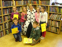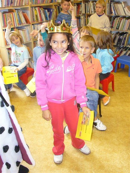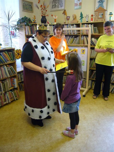 V malé přestávce jsme si trochu odpočinuli při poslechu známé písničky z pohádky Princové jsou na draka, někteří si s chutí zazpívali a zatančili. Potom se své vlády ujala Písmenková královna, která zhodnotila předvedené výkony a zahájila slavnostní pasování. Jednotlivé děti předstupovaly v abecedním pořadí před její trůn a královna je svým žezlem pasovala na malé čtenáře, každý dostal pasovací listinu se svým jménem, miniknížku a sladkou maličkost. Na závěr se každá třída společně s Písmenkovou královnou vyfotografovala a pak už jsme se rozloučili s přáním hezkých prázdnin a dalších setkání nad knížkami v příštím školním roce.