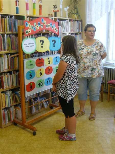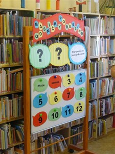 Po veršovaném přivítání jsme dětem nejprve vysvětlili rozdíl mezi prózou, poezií a dramatem na příběhu o sedmi neposlušných kůzlatech, který zazněl jako vyprávění, veršovaná pohádka i divadelní hra. Potom na nás čekala magnetická tabule s dvanácti komiksovými bublinami, které představovaly dvanáct různých literárních žánrů, k nim děti vybíraly a přiřazovaly knihy z připravené výstavky. Kromě toho každá bublina skrývala jeden úkol, při jeho plnění jsme si společně něco přečetli, něco se dozvěděli a samozřejmě jsme se i trochu pobavili.